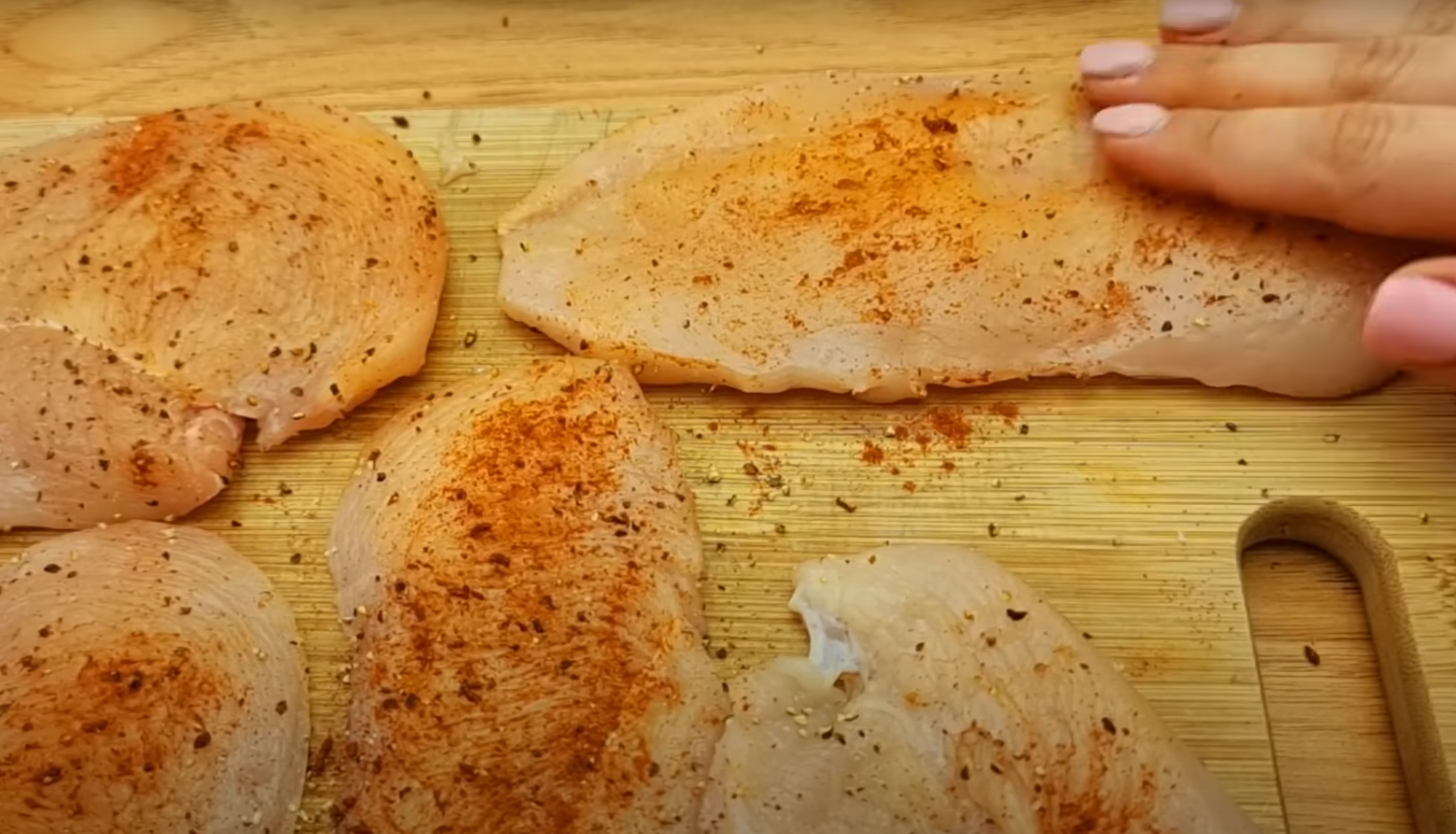 Piersi rozbić na kawałki, a następnie rozbić tłuczkiem. Każdy kawałek posmarować ziołami z obu stron, doprawić solą i pieprzem.