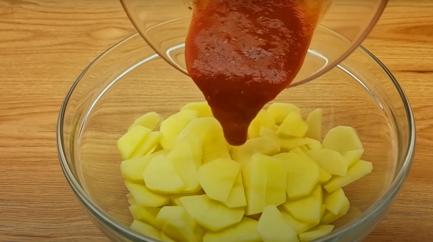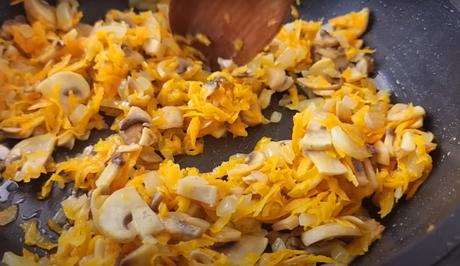 Cebulę drobno posiekać i podsmażyć na patelni. Następnie opłukać grzyby i drobno je posiekać. Na koniec dodać na patelnię obraną marchewkę. W misce połączyć obrane ziemniaki i koncentrat pomidorowy. Dodać jeden ząbek czosnku, wodę, sól i pozostałe zioła.