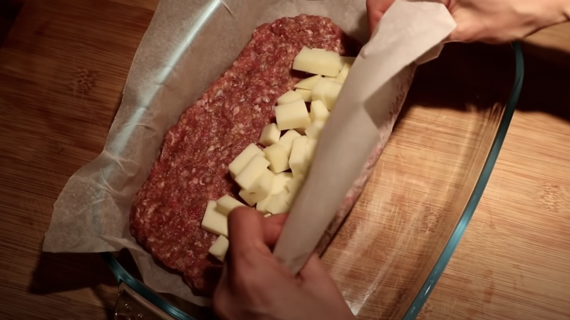Zamiast przygotowywać standardowe klopsiki, można położyć ser bezpośrednio na mielone i całość zwinąć w papier.