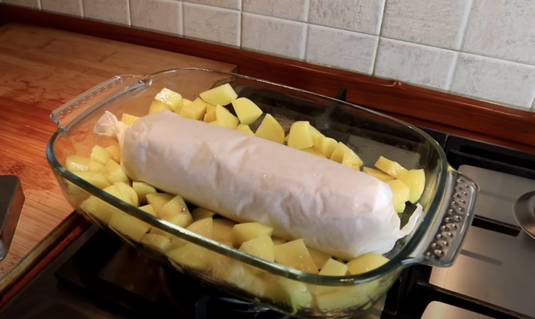 Zaleca się, żeby roladę zawinąć w jeszcze jedną warstwę papieru do pieczenia. Pokrojone w kostkę ziemniaki posolić i umieścić je w natłuszczonym olejem naczyniu żaroodpornym, a roladę płożyć na ziemniakach.