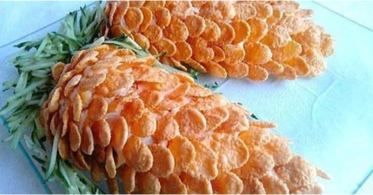 Najlepiej sprawdzi się do tego tarka koreańska. Weź płatki kukurydziane i delikatnie powtykaj je w sałatkę tak, by ta wyglądała jak szyszka.