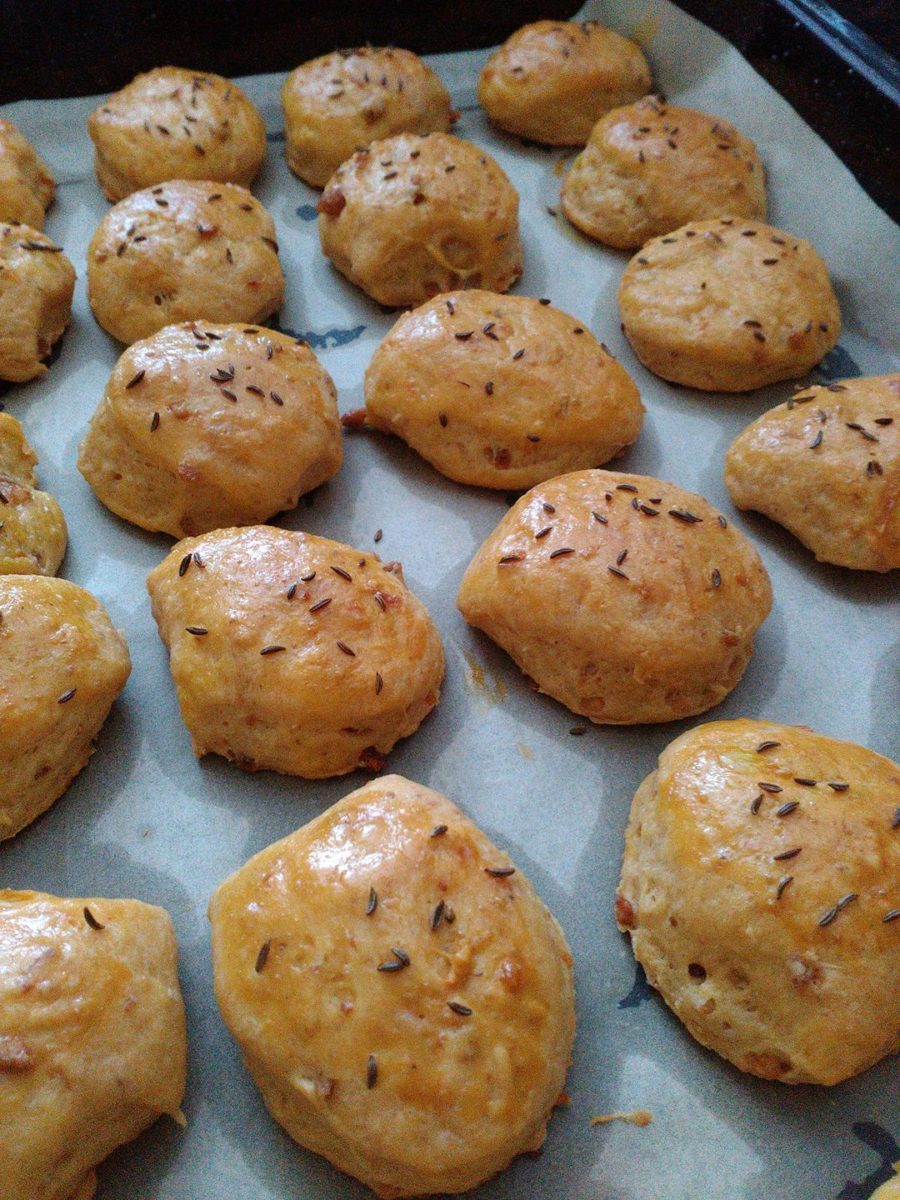 Wytnij z niego okrągłe bułeczki, umieść je na papierze do pieczenia. Posmaruj roztrzepanym jajkiem i posyp serem lub sezamem. Piecz 20 minut w 200 stopniach.
