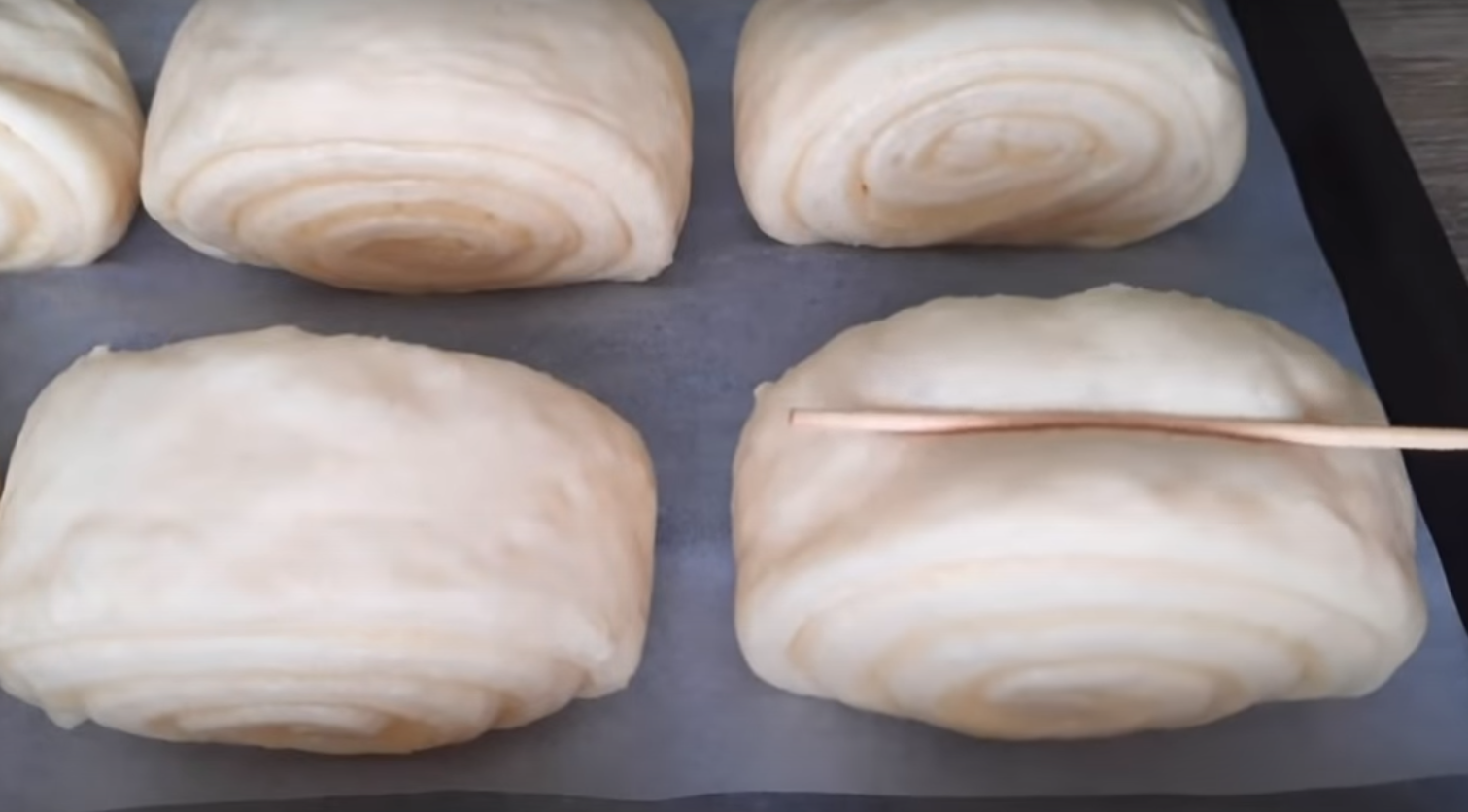Ciasto połóż na posypanym mąką blacie, rozwałkuj na prostokąt i równomiernie rozłóż na nim krem. Zwiń w rulon, a następnie pokrój w szersze ślimaki. Ułóż je obok siebie na blaszce pokrytej papierem do pieczenia i odstaw na kolejne 20 minut. Po środku każdego ślimaka zrób szpikulcem wżłobienie i posmaruj wierzch ubitym żółtkiem wymieszanym z mlekiem.