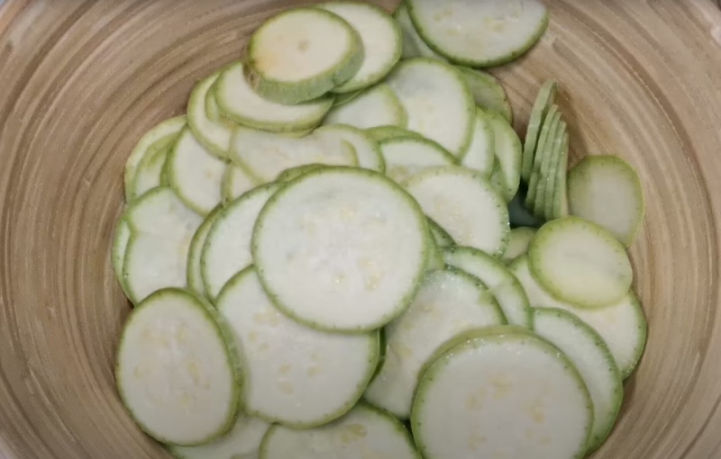 Najlepsza do tego przepisu będzie młoda cukinia, bo będzie miała słabo rozwinięte gniazda nasienne i będzie cienka. Pokrój ją na bardzo cienkie plasterki.