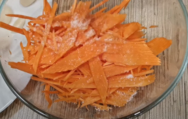 Pokrojoną cukinię włóż do głębokiej miski. Posyp łyżeczką soli, wymieszaj dokładnie i odstaw na 30 minut.