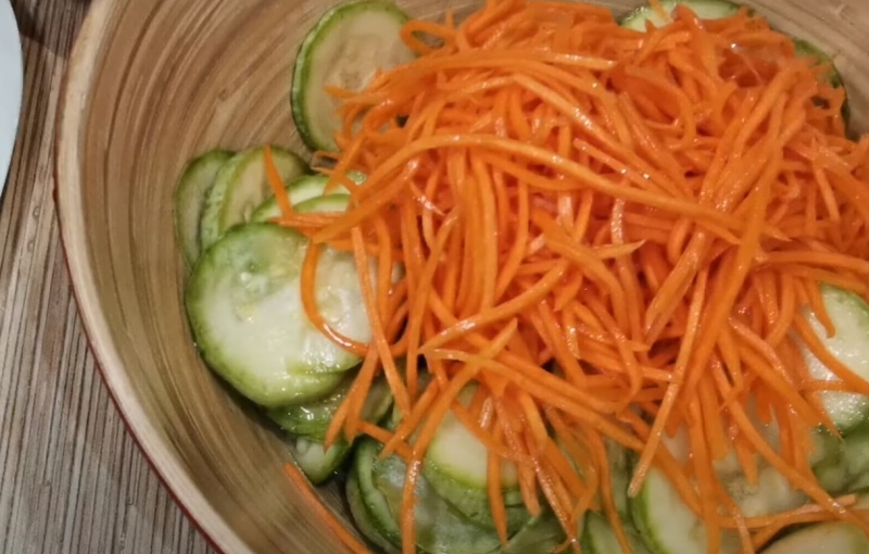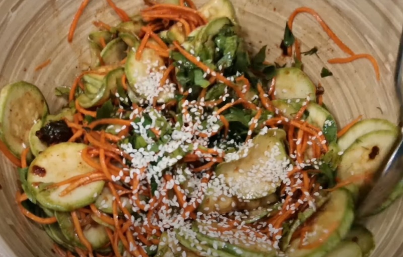 Z cukinii oraz z marchewki odciśnij dokładnie nadmiar płynów. Połącz warzywa w jednej misce. Polej wszystko przyrządzonym w poprzednim kroku dressingiem.