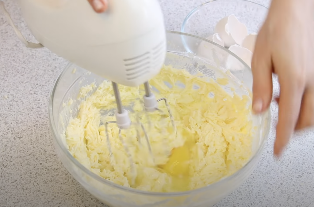 Masło umieścić w dużej misce. Za pomocą miksera kremować je do uzyskania gładkiej konsystencji. Do masła wmieszać proszek do pieczenia i sól. Następnie stopniowo dodawaj przesianą mąkę.