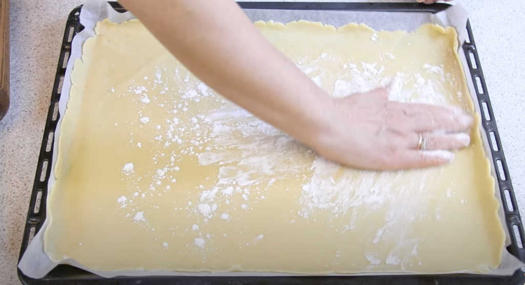 Gdy wyschnie, można je wyjąć i podzielić na dwie równe części. Jedną porcję ułożyć na blasze wyłożonej papierem do pieczenia. Ciasto obficie posypać krochmalem.