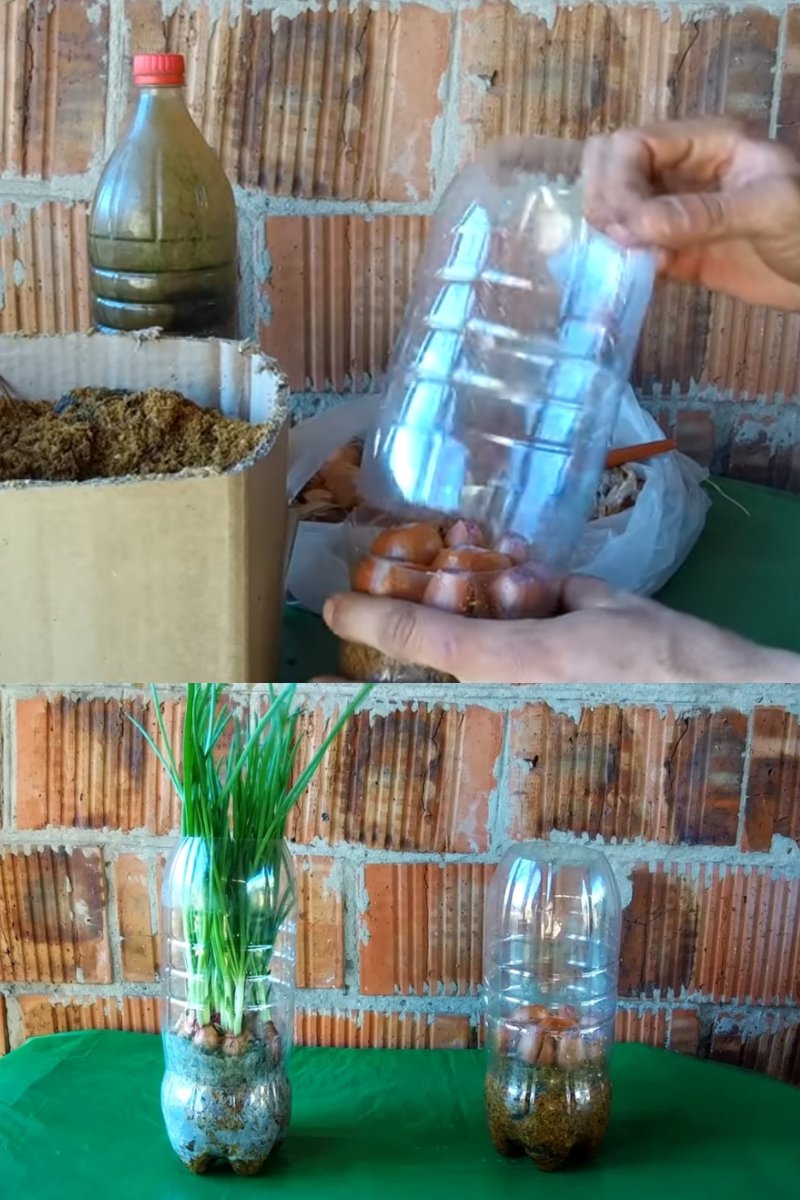Wybieramy małe cebulki, aby zmieściło się ich około 5. Ścinamy z każdej cebulki górną część, tak aby odsłonić wnętrze. Cebulki sadzimy w podłożu tak jak w zwykłej ziemi i podlewamy 1/3 szklanki wody. Na koniec zakładamy górną część butelki i stawiamy na parapecie.