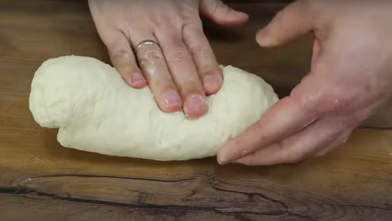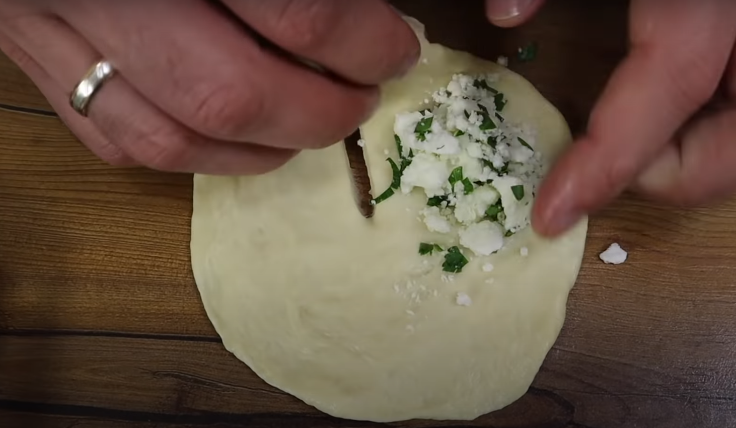 Następnie poklei kulki z ciasta uformuj w placek, na jego brzegu ułóż nadzienie i zawiń jak na zdjęciu poniżej.