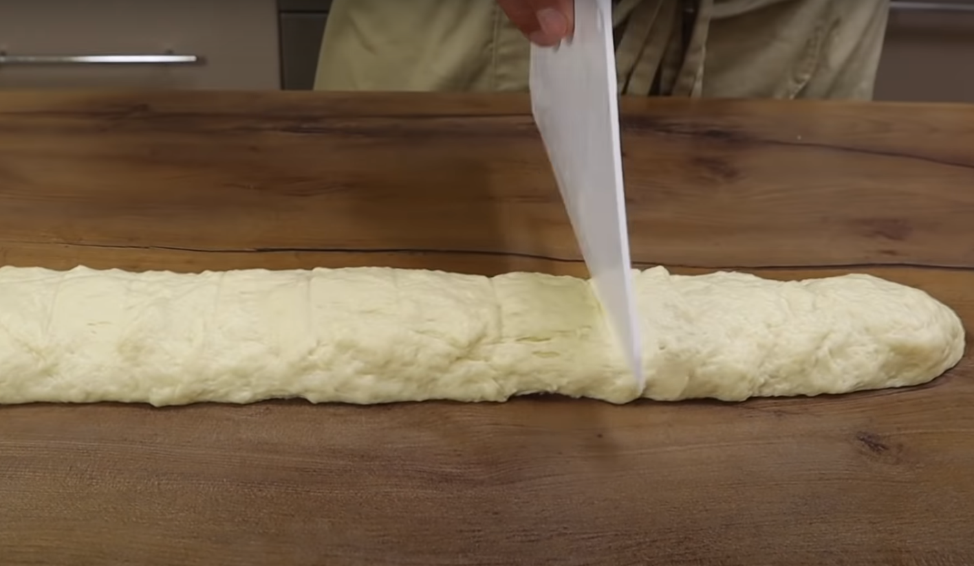W międzyczasie posiekaj świeże zioła i wymieszaj z serkiem kanapkowym – według uznania możesz wybrać inny rodzaj nadzienia. Następnie uformuj ciasto w długi rulon i podziel równo na mniejsze kawałki.