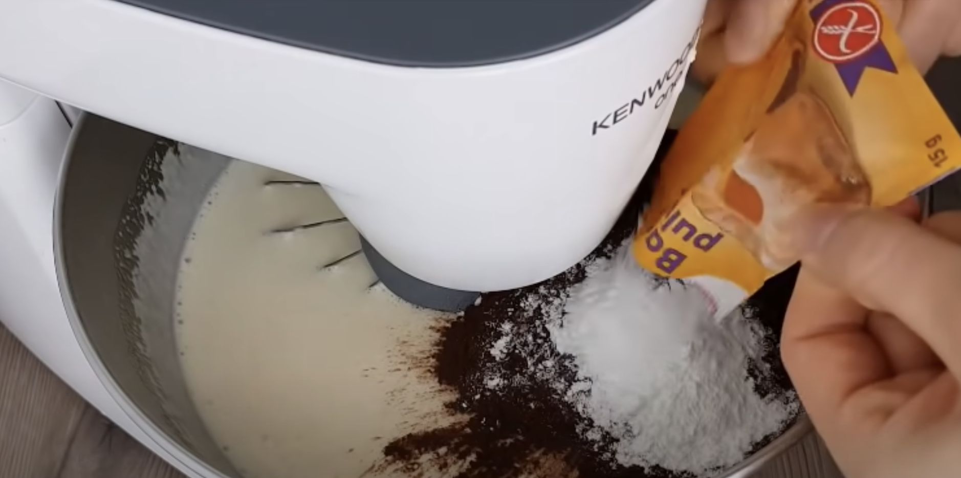 Wciąż mieszając, dodajemy kakao, proszek do pieczenia i przesianą przez sito mąkę. Całość mieszamy, aż osiągnie jednolitą konsystencję.
