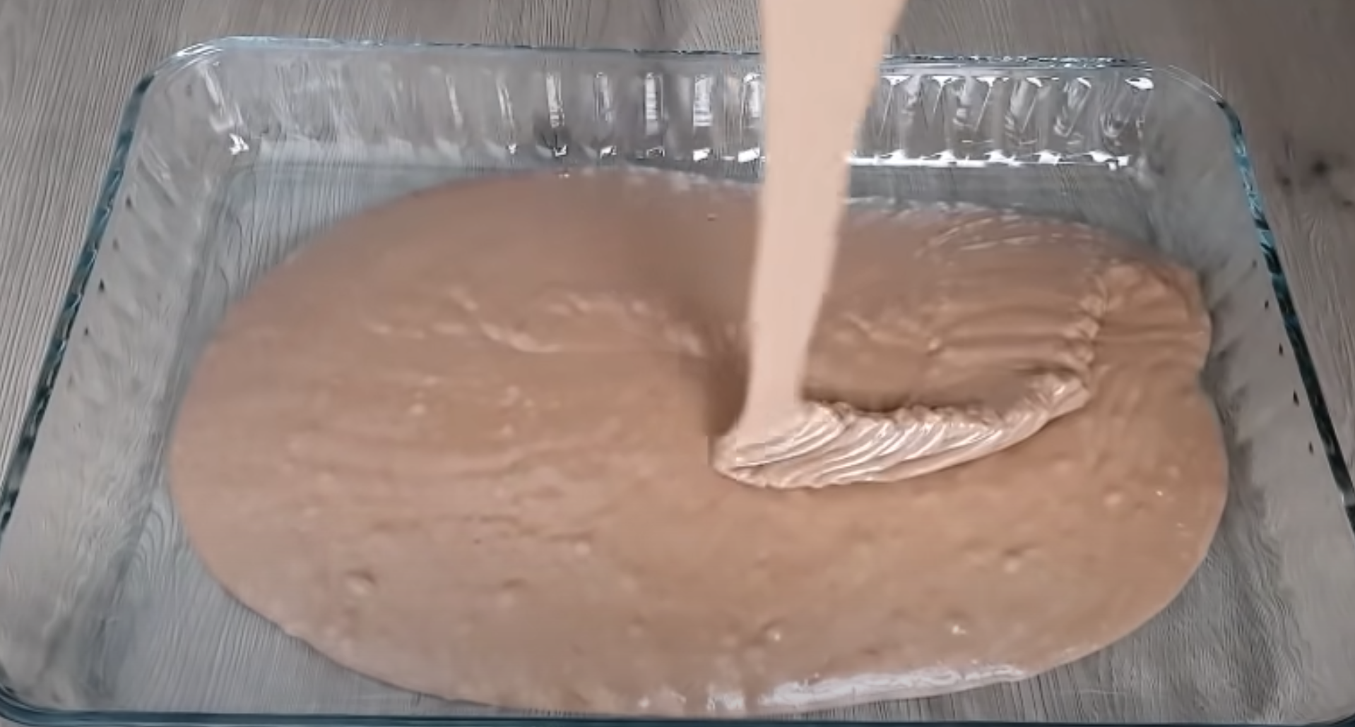 Wylewamy przygotowane ciasto na natłuszczoną, wcześniej przygotowaną brytfannę. Pieczemy w 180 stopniach przez ok. 25 minut.