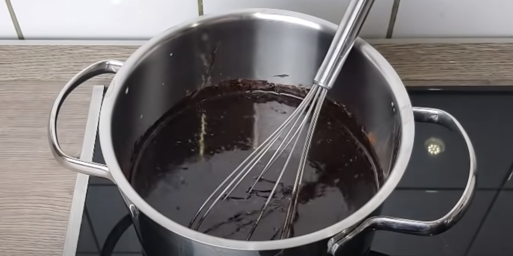 Na koniec wrzucamy do przygotowanej polewy kawałki czekolady i gotujemy przez kolejne dwie minuty, ciągle mieszając. Gdy czekolada się rozpuści, zdejmujemy polewę z gazu.