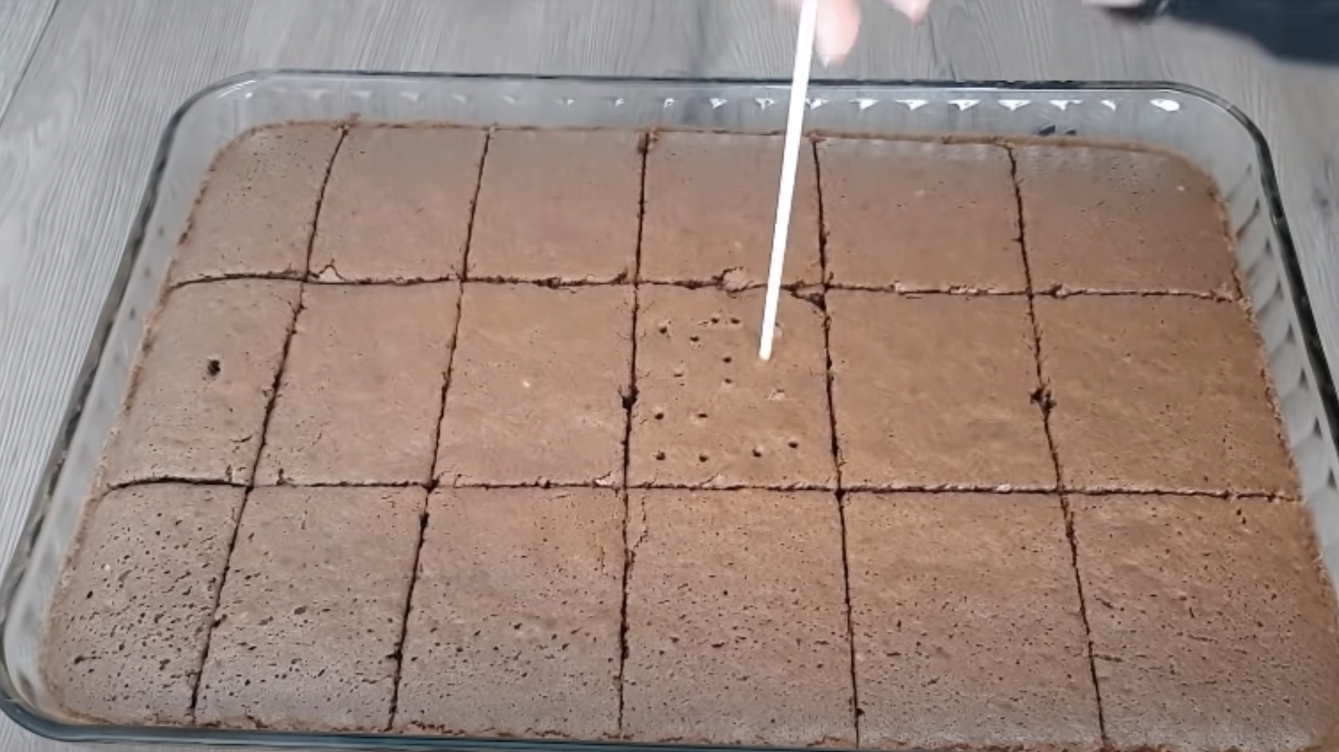Upieczone ciasto kroimy w równomierną kostkę i nakłuwamy za pomocą wykałaczek.