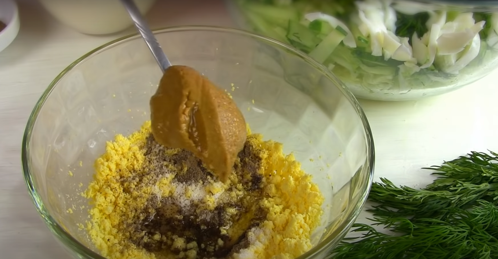 Ugotuj jajka i umyj kapustę. Następnie poszatkuj kapustę. Ugotowane jajka można pokroić w plastry i umieścić w dużej misce razem z poszatkowaną kapustą. Zaleca się również dodanie soli i ziół. Po wierzchu można skropić oliwą z oliwek. Dodaj 1-2 łyżeczki musztardy i 3-4 łyżki śmietany. Wszystko wymieszać. Teraz możesz podawać! Smacznego!