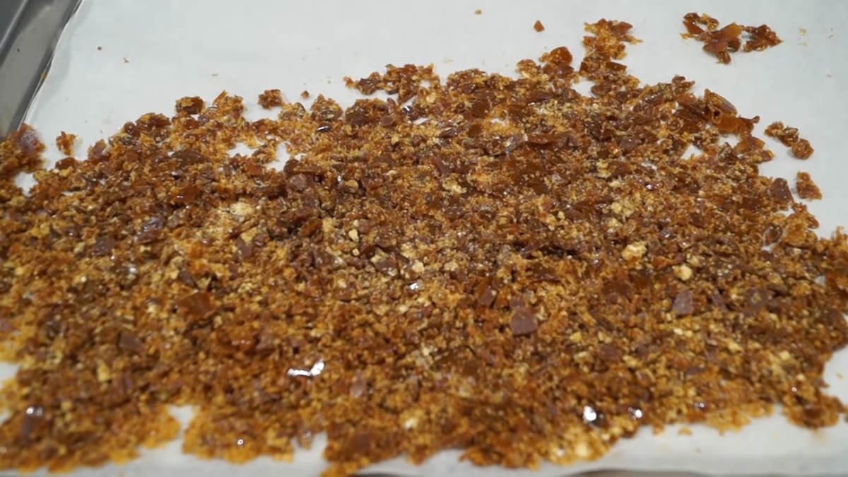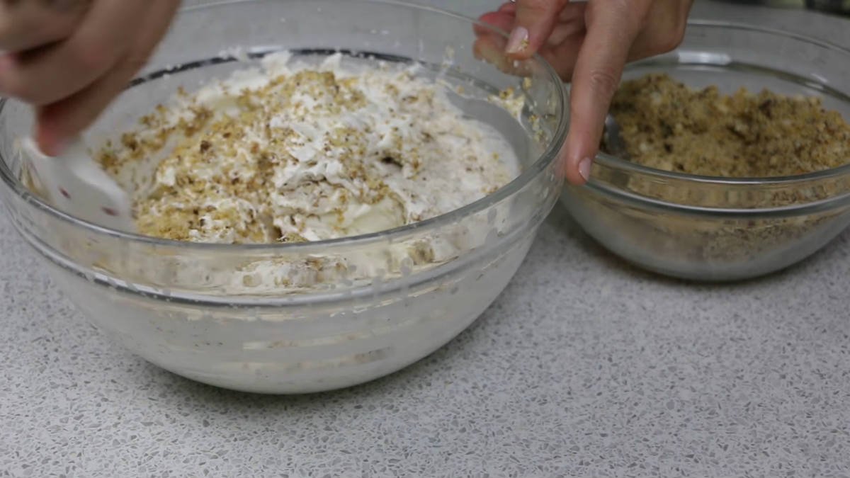 Ugotuj cukier w rondelku. Rozsyp cukier na papier pergaminowy. Przykryj go kolejną warstwą i pozostaw do stwardnienia. Następnie rozdrobnij cukier za pomocą wałka. Dodaj karmelizowany cukier, resztę posiekanych orzechów i ubitą na sztywno śmietanę.