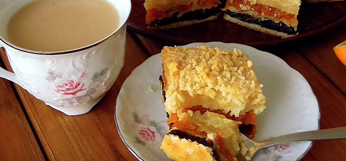 Połóż suszone morele na cieście, rozprowadzając je równomiernie na całej powierzchni. Przykryj warstwę suszonych moreli kolejną warstwą rozwałkowanego ciasta, kolejno rozłóż nadzienie z cytryny. Przykryj go ostatnim kawałkiem ciasta. Posyp pozostałymi okruchami na wierzchu.