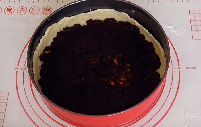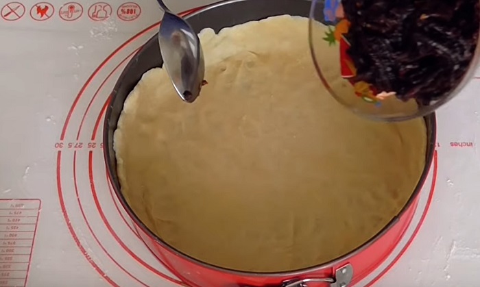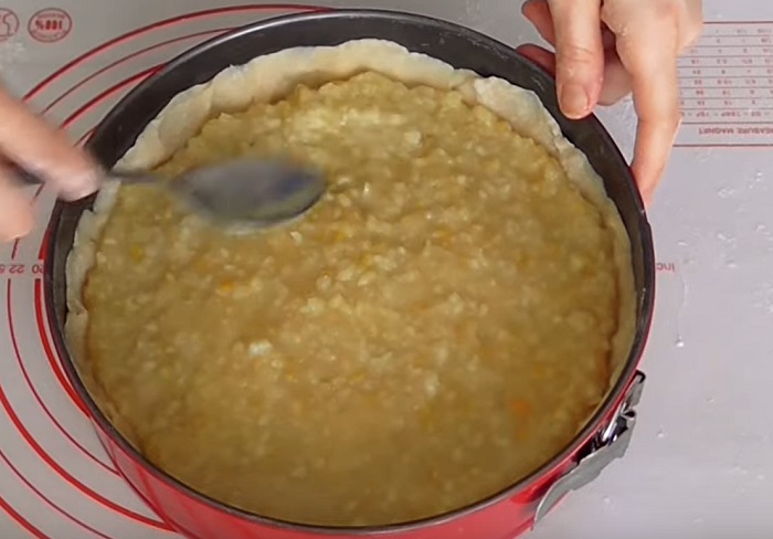Rozwałkuj większą część ciasta i ułóż na dnie naczynia do pieczenia, nie zapomnij o bokach formy. Wcześniej nasmaruj formę małym kawałkiem masła lub przykryj kawałkiem pergaminu.