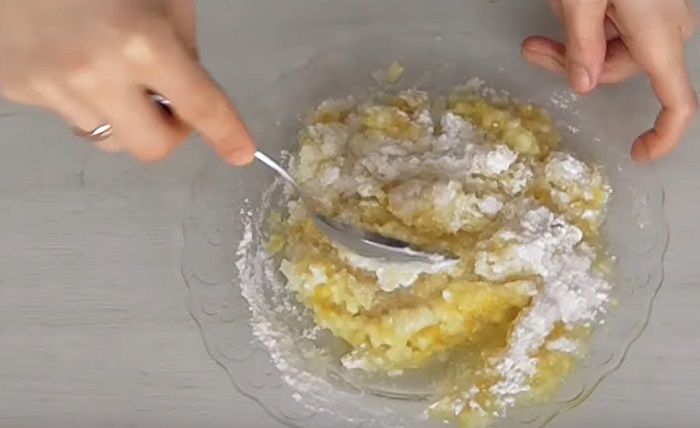 Dodaj cukier i łyżkę mąki do cytryny. Dobrze wymieszaj.