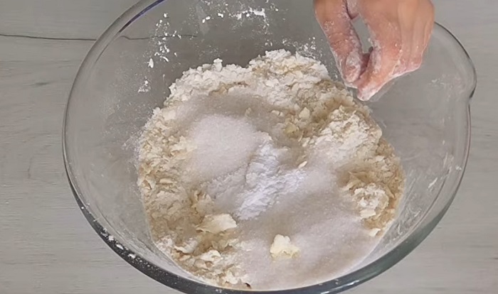Aby przygotować ciasto, zetrzyj na tarce zimne masło (najlepiej schłodzone w zamrażalce) z mąką, aż powstaną tzw. „okruchy”. Odłóż na bok dwie łyżki „okruchów”, aby posypać nimi później ciasto.