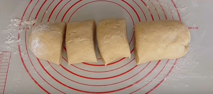 Przenieś ciasto na stół posypany mąką, uformuj je w rulon i podziel na 4 części. Jedna z części powinna być nieco większa niż reszta ( jak na zdjęciu poniżej).