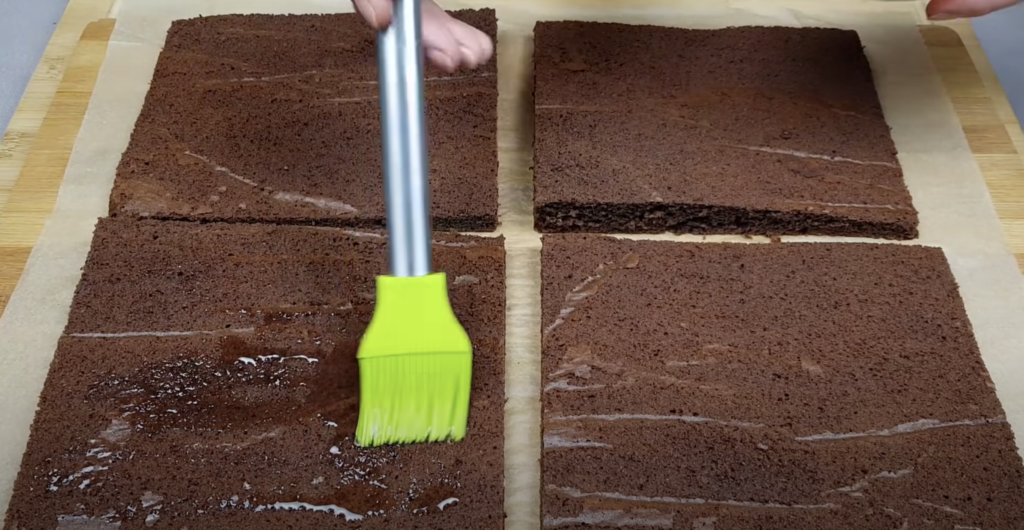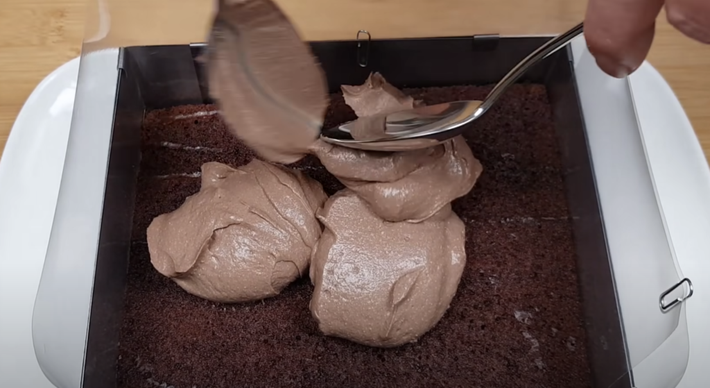 Następnie nałóż drugą część ciasta, lekko dociśnij i ponownie rozprowadzić 1/3 kremu. Kontynuuj, aż wykorzystasz składniki. Następnie włóż ciasto do lodówki. Przygotuj polewę. Masło wymieszaj z mlekiem i doprowadź do wrzenia. Dodaj połamaną czekoladę do gorącej mieszanki i mieszaj, aż czekolada całkowicie się rozpuści.