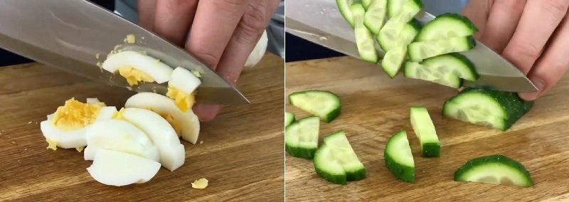 Jajka ugotuj na twardo i ostudź. Następnie każde z nich obierz. Ogórki i jajka pokrój w dość drobną kostkę.