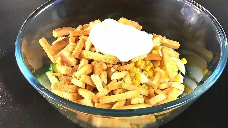 Całość wymieszaj razem z majonezem (jego ilość dobierz według własnego uznania). Przed samym podaniem sałatkę posyp grzankami (nie wcześniej, aby zachowały swoją chrupkość).