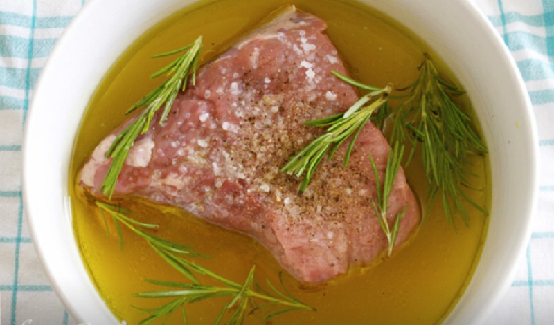By przygotować marynatę do mięsa wymieszaj ze sobą te trzy płynne składniki: ocet winny, wino, oliwę z oliwek. Następnie całość dopraw rozmarynem i pieprzem.