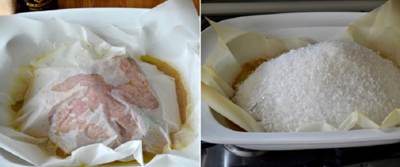 Przygotuj formę do pieczenia z wyższymi bokami. Przenieś do niej mięso i całość zalej marynatą. Ważne jest by mięso było przykryte pergaminem. Wierzch posyp przygotowaną wcześniej solą. W nagrzanym do 195 ° C piekarniku ostrożnie umieść potrawę. Po upływie 30 minut twój pyszny posiłek jest gotowy.