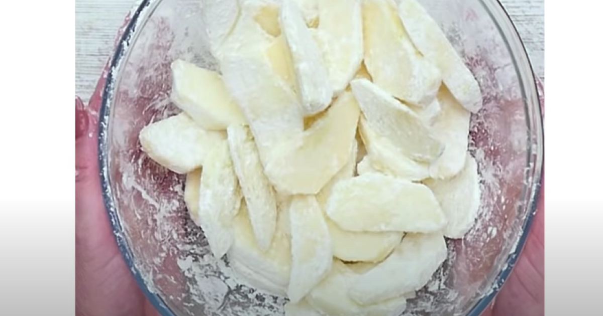 Jabłka obieramy ze skórki i kroimy w cienkie plasterki. Posypujemy skrobią ziemniaczaną.