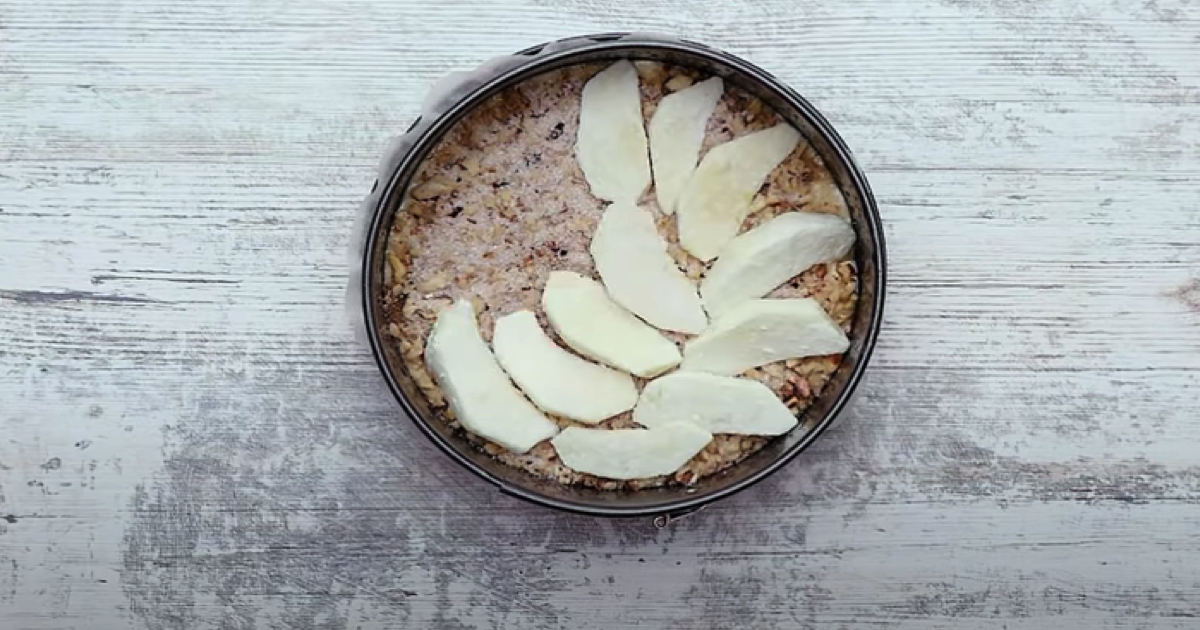 Pokrywamy drugą warstwą jabłek i nakładamy mieszankę orzechową. Pieczemy w 180’C przez 50-55 minut.