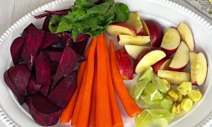 Obierz buraki, usuń rdzeń i pokrój w grubszą kostkę. Podobnie przygotuj marchewkę, imbir i jabłka, przy czym jabłka pozostaw w skórce, usuwając jedynie rdzeń. Limonki lub cytryny obierz tak, by usunąć białe, gorzkie części. Pokrój miąższ w ćwiartki.