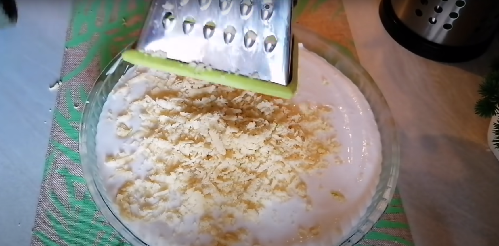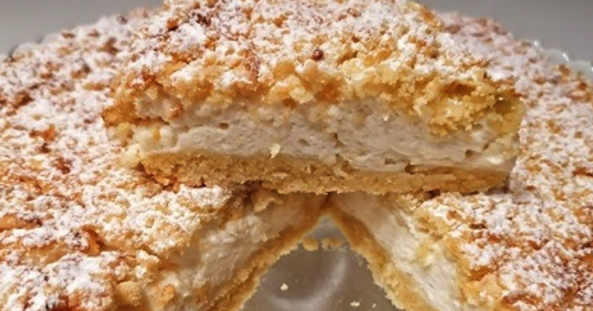 Uzyskaną masę wylej na spód ciasta w formie. Drugą część ciasta zetrzyj na tarce, tworząc kruszonkę, którą następnie rozsyp równomiernie na wierzchu kremu.