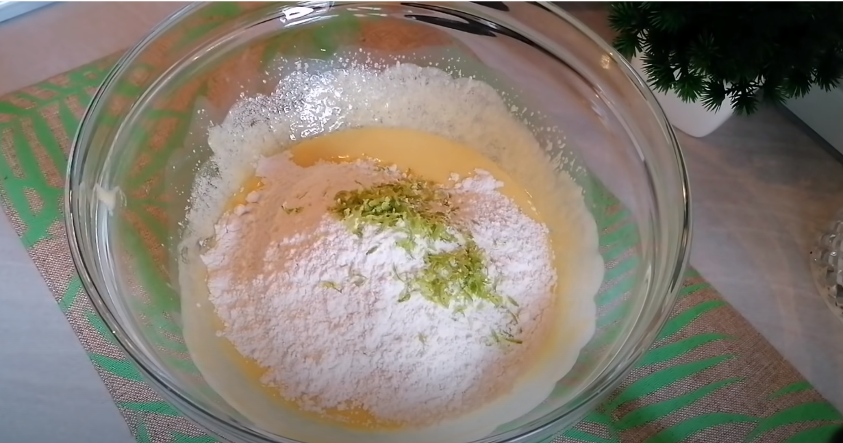 Do ubitych żółtek, powoli dodaj masło, ciągle mieszając na niskich obrotach. Do tej masy dodaj przesianą mąkę, proszek do pieczenia oraz skórkę z umytej i startej na drobnej tarce cytryny lub limonki.