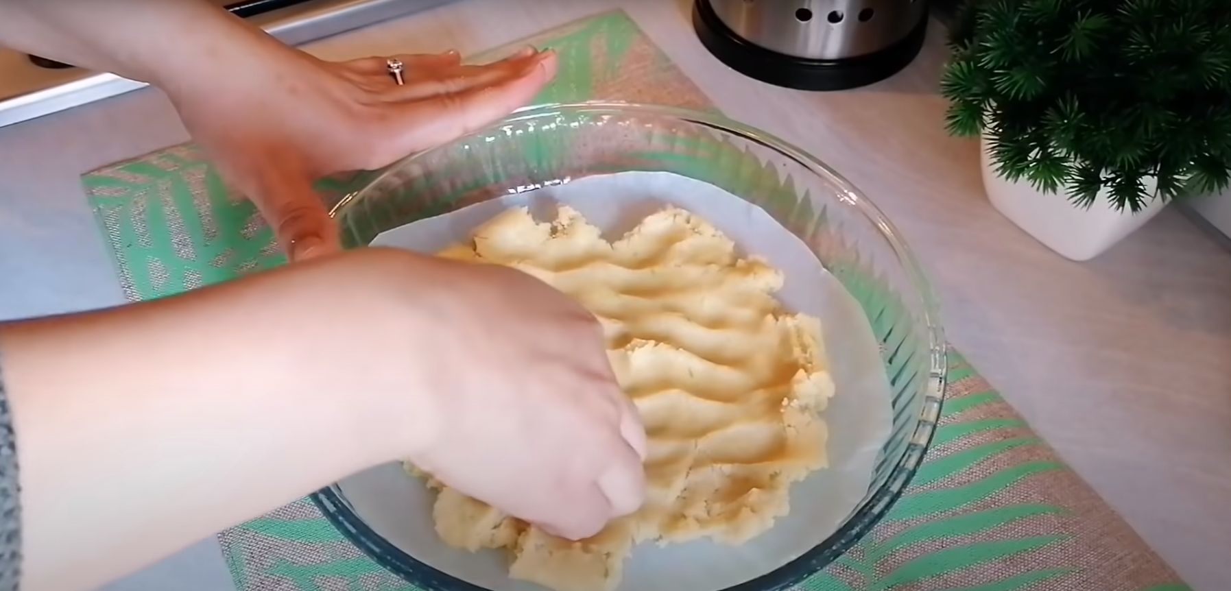 W międzyczasie przygotuj formę do pieczenia, wykładając jej dno papierem. Po upływie czasu wyjmij ciasto z zamrażarki. Jedną część ciasta równomiernie rozprowadź na dnie formy. Drugą odłóż na później.