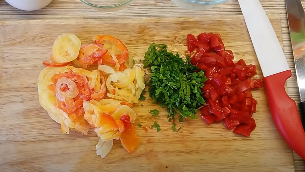 Drobno posiekaj pietruszkę. Paprykę należy pokroić na pół-pierścienie. Dodaj dressing do zupy z klopsikami i ziemniakami.