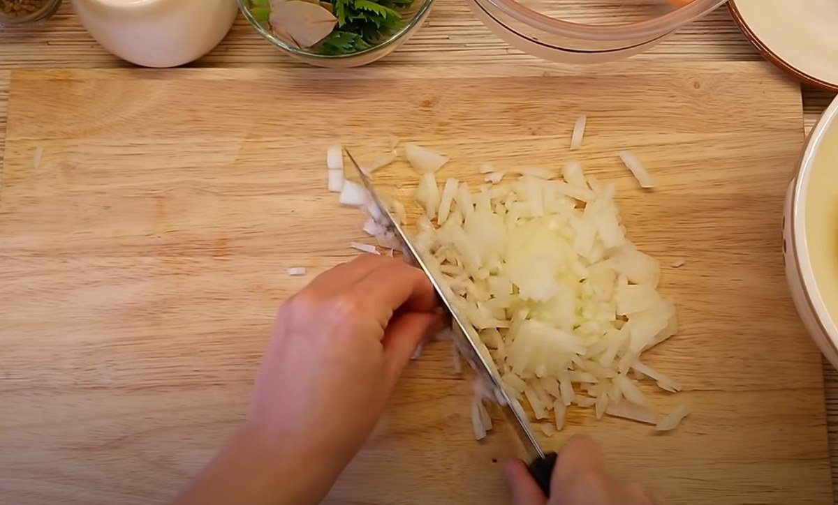 Teraz czas na składniki do zupy. Cebulę drobno posiekaj i wrzucić do garnka z wrzącą wodą. Gotuj na małym ogniu.