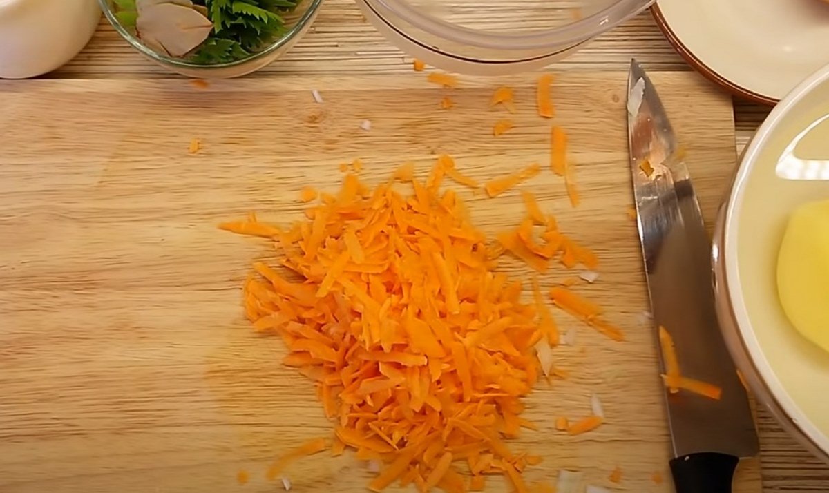 W międzyczasie zajmij się marchewkami. Zetrzyj je na grubej tarce. Kiedy skończysz, włóż startą marchewkę do garnka, w którym cebula już się gotuje.