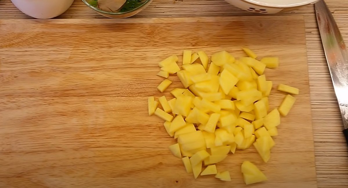 Ziemniaki obierz i dobrze umyj. Następnie pokrój je dowolnie: w paski, kostki. Dodaj ziemniaki do garnka – obok cebuli i marchewki. Posól wodę.